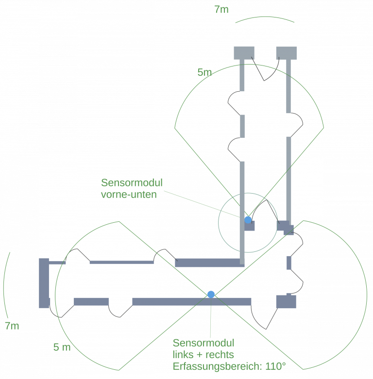 Grüner Bereich ist der Mindesterkennungsbereich 5 m.